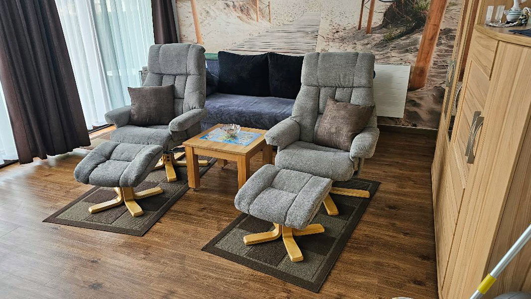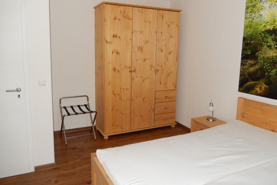 Die Ferienwohnung besteht aus einem Wohnbereich mit Sitzgruppe und ausziehbarer Schlafcouch, einem Essbereich mit Esstisch, einer komplett ausgestatteten separaten Küche, einem Schlafzimmer mit Doppelbett und einem weiteren Schlafzimmer mit Doppelbett. Das Badezimmer ist mit einer Dusche ausgestattet.