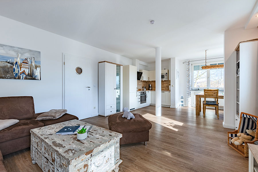 Auf praktischen 55 Quadratmetern verteilen sich insgesamt zwei Zimmer. Mittelpunkt ist der kombinierte Wohn-Ess- und Kochbereich mit einer gemütlichen Sofagarnitur neben Gratis-WLAN und SAT-TV. Die praktische Küchenzeile verfügt über allerhand Equipment – von der Kaffeemaschine über den Geschirrspüler bis zur Mikrowelle. Das Schlafzimmer mit Doppelbett und das Badezimmer mit Dusche, WC und Föhn schließen sich an den Wohnbereich an.